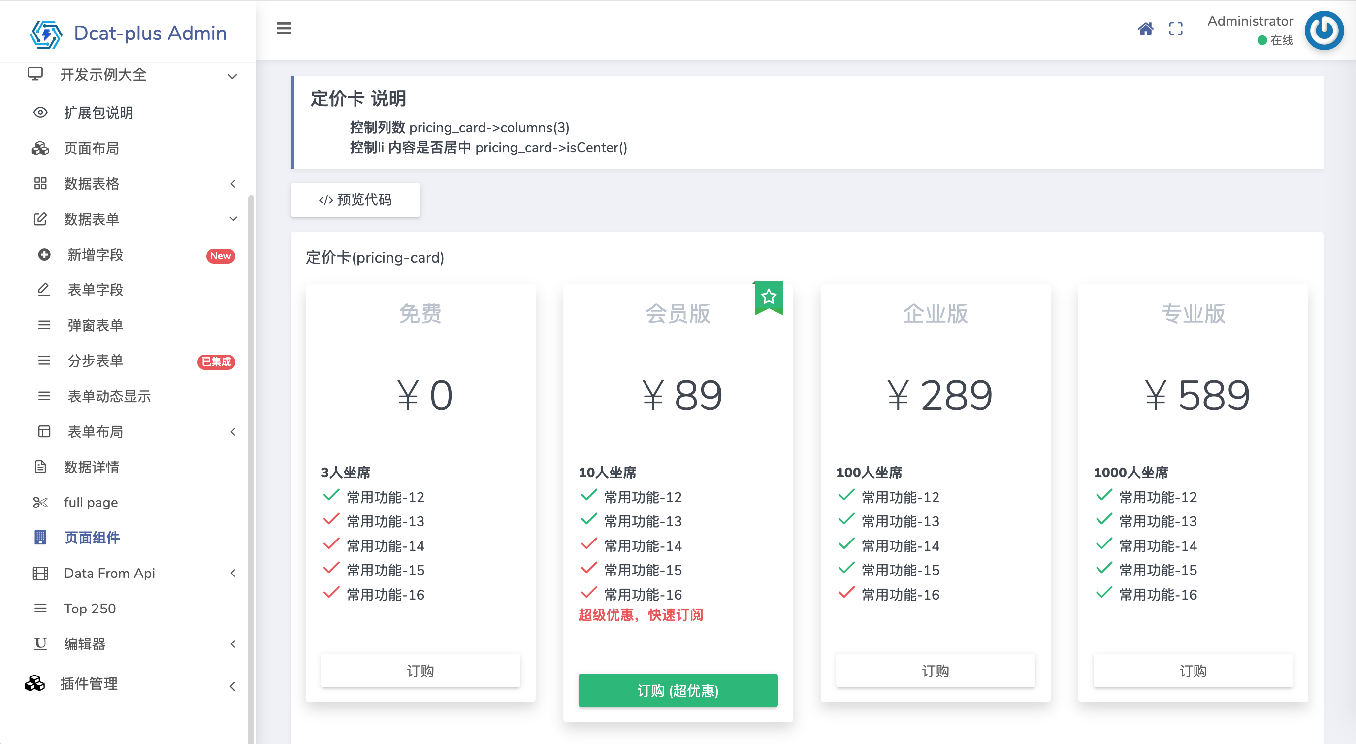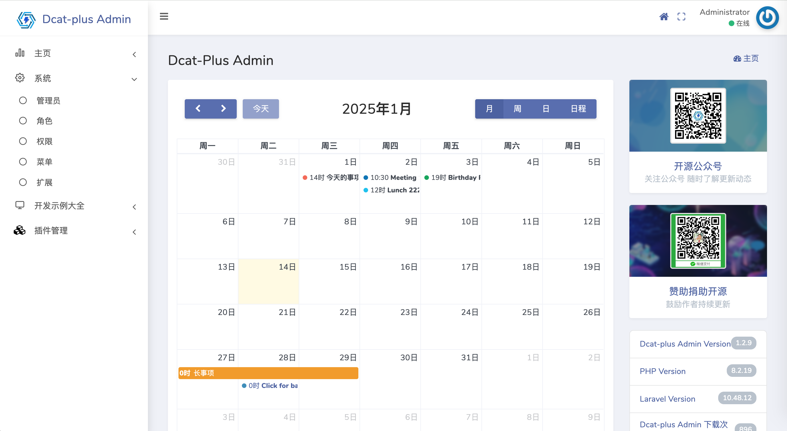 Dcat-Admin 是一个基于 Laravel 框架开发的灵活且功能强大的后台管理系统构建工具。它提供了丰富的 UI 组件和便捷的开发体验,能够帮助开发者快速搭建功能完善的后台管理系统。作为一个开源项目,Dcat-Admin 在保持简单易用的同时,还具备了强大的可扩展性。 系统基于 Laravel 10+ 开发,采用 Bootstrap 4 构建前端界面,支持响应式布局设计,使其能够完美适配各种设备。它内置了数据表格和表单构建工具、文件上传管理、树形表格等实用功能,同时提供了完善的 RBAC 权限管理机制,确保系统安全可靠。极大地降低了开发者的学习成本。无论是构建简单的管理后台,还是开发复杂的企业级应用,Dcat-Admin 都是一个理想的选择。